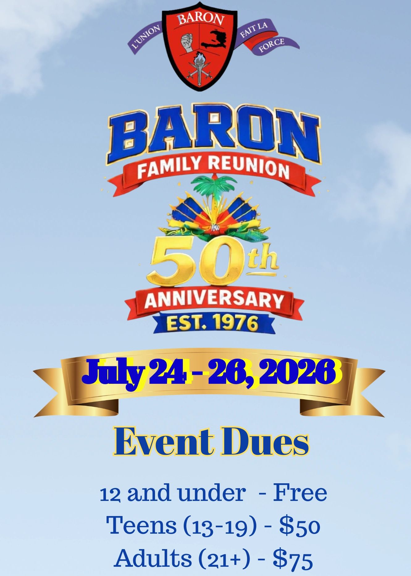 This year is our 50th Family Reunion, which means the t-shirts are going to be special collector’s items. Years from now you’ll be able to say, “I was there for the 50th!”- so you definitely want one.